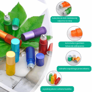 Zestaw 7 kolorowych szklanych buteleczek o pojemności 5 ml, idealnych do przechowywania i aplikacji własnych mieszanek olejków eterycznych. Każda buteleczka wyposażona jest w kulkę roll-on i zakrętkę, co zapewnia wygodne, precyzyjne i higieniczne stosowanie. Doskonałe do codziennego użytku, podróży lub jako prezent. Sprzedawane wyłącznie w pakietach po 7 sztuk.